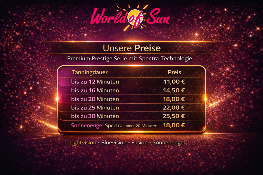Für regelmäßige Besonnung lohnt sich besonders unser Sun Club. Bereits ab 8,51 € pro Woche clever sonnen und dauerhaft sparen. Informieren Sie sich gerne in unserem Bereich Sun Club über alle aktuellen Tarife.